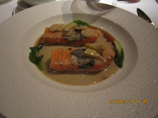 This was the version of the salmon dish on the tasting menu. The original version on the prix fixe featured Sweet and Sour Hon Shimeji Mushrooms and Lotus Root; Maitake Broth. I was originally deciding between the salmon and the red snapper. Our captain thought that my first two courses (lobster and langoustine) were on the light side, so suggested this for me. Strangely enough, that made it three courses with truffles. I wonder if "The Fish is the Star of the Plate" should be changed to "The Truffle is the Star of the Plate". The dish was good. I wasn't expecting to be blown away by a salmon preparation, and it didn't.